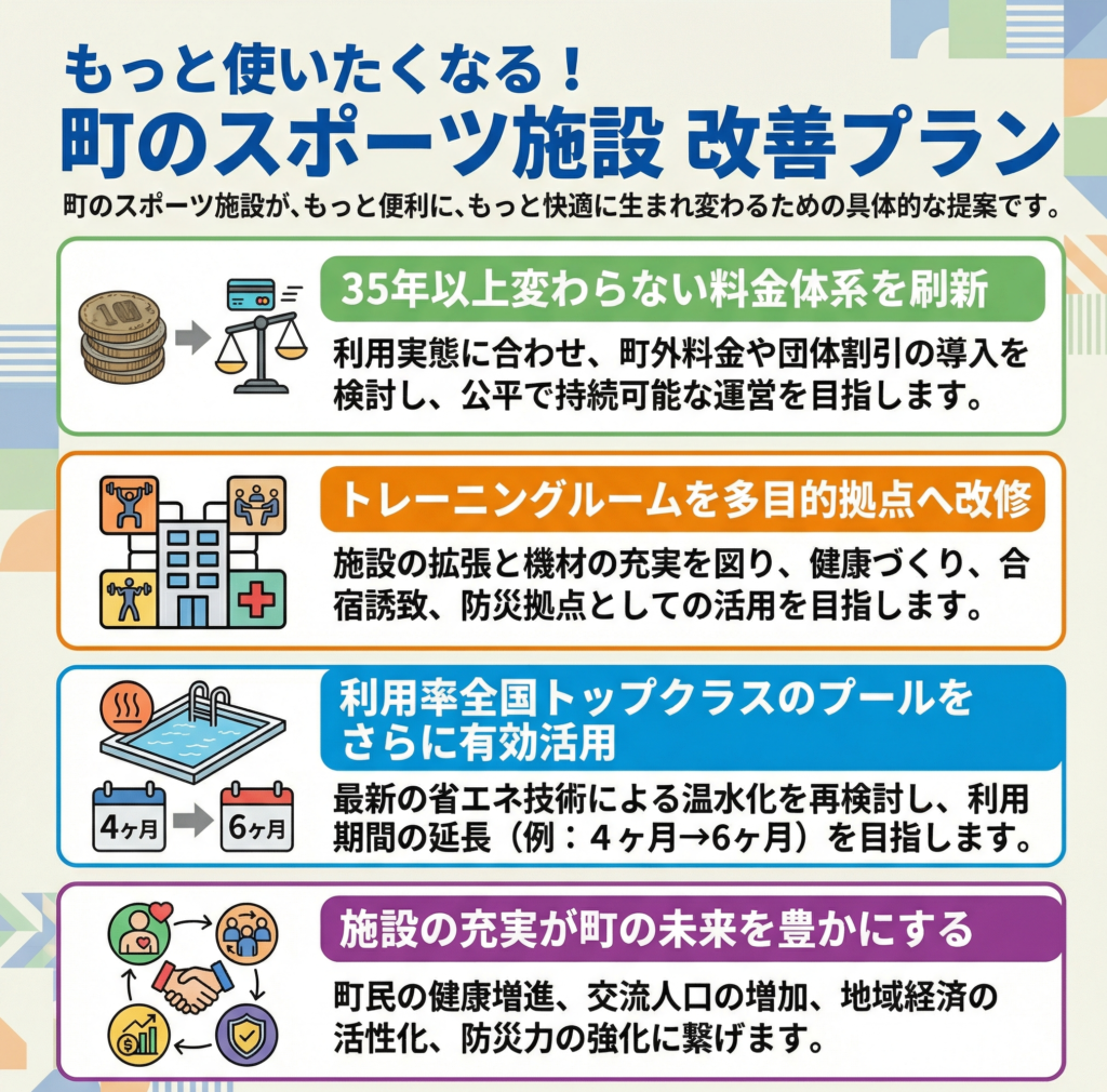 令和7年9月議会の一般質問について、ご報告いたします。 今回のテーマは、私たちの健康づくりに欠かせない「スポーツ施設の利活用」です。 町民の皆様からお寄せいただく「もっと使いやすくしてほしい」「将来も安心して使いたい」という声を大切に、「町... -
