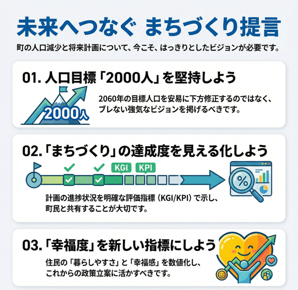 令和7年3月議会において一般質問に立ちました。今回は、「この町の未来をどう守るか」そして「皆さまの暮らしの幸福をどう高めるか」という、最も大切なテーマについて町長と議論を交わしました。そのポイントを、簡潔にご報告します。 1. 「人口2000人」... -