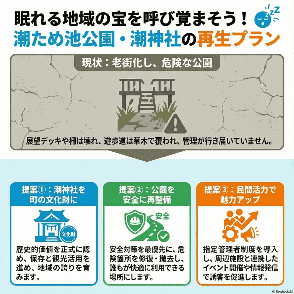 令和7年6月議会にて一般質問を行いましたので、その成果をご報告いたします。 今回のテーマは、「潮ため池公園と潮神社の活用・整備」についてです。 「公園の柵が壊れていて危ない」「せっかくの潮神社がもっと評価されるべき」といった、町民の皆様から... -