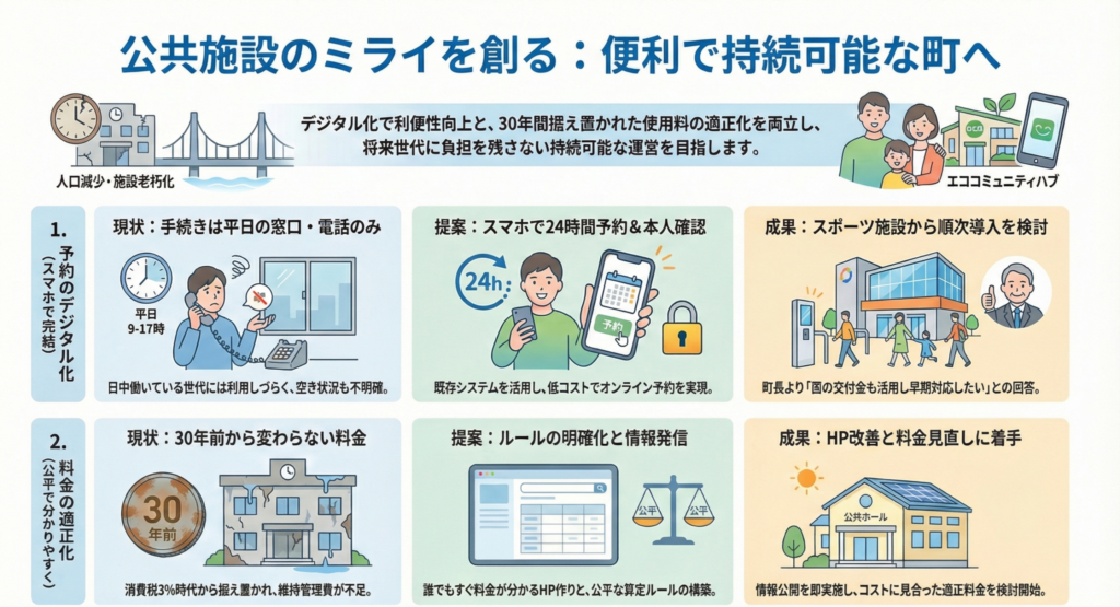 人口減少や少子高齢化が進む中、私たちの町にある大切な公共施設を、将来にわたってどのように維持していくかはとても重要な課題です。 今回の一般質問では、町民の皆さまの「使いやすさ(利便性の向上)」を高めることと、今の時代に合った「適正なご負担... -