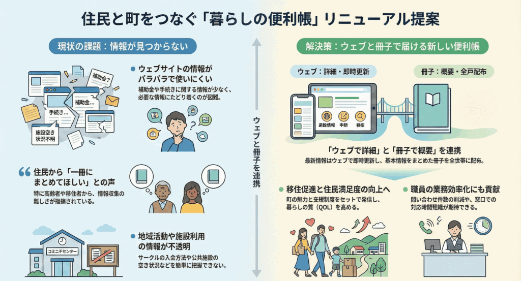【行政への提案】 低コストで迅速な対応が可能な「ウェブサイトの情報整理」から始め、その内容を「冊子化」して全世帯へ配布するという、段階的なアプローチを提案しました。これは単なる冊子作りではなく、問い合わせ対応を減らす「業務効率化」であり、未来の移住者を呼び込むための「投資」でもあります。